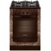 Полноразмерная газовая плита, цвет-коричневый, с нанесенным рисунком текстуры мрамора на фасаде. На стеклянной рабочей поверхности установлены широкие основания для газовых горелок, укрытых фигурными чугунными решетками. Духовой шкаф помимо основной нижней горелки может работать в режиме "гриль". Основной нагрев - термостатический, направляющие для движения противней выполнены съемными для быстрой и удобной очистки. Для равномерного запекания большого куска мяса вместе с плитой поставляется вертел, легко устанавливается в духовке при необходимости. На панели управления расположен таймер, механический, включается поворотом ручки.