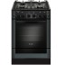Полноразмерная газовая плита черного цвета со стеклянным фасадом и рабочим столом. На варочной поверхности установлены широкие основания для газовых горелок, укрытых фигурными чугунными решетками. Духовой шкаф помимо основной нижней горелки может работать в режиме гриль. Основной нагрев - термостатический, направляющие для движения противней выполнены съемными для быстрой и удобной очистки. Для равномерного запекания большого куска мяса вместе с плитой поставляется вертел, легкоустанавливаемый в духовке при необходимости. На панели управления расположен таймер, механический, включается поворотом ручки.