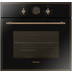 Духовой шкаф со стеклянным фасадом и декоративным оформлением в ретро-стиле. По центру панели управления расположены две поворотные ручки(выбор режима нагрева, выбор температуры) и таймер, стилизованный под аналоговые часы. Четыре ТЭНа (верхний, нижний, гриль и круговой), восемь режимов работы и термостатированный нагрев, автоматически поддерживающий заданную температуру. С внутренним объемом до 55 литров можно готовить одновременно на нескольких уровнях. Решетка и противень мягко скользят по проволочным направляющим, в комплектации есть телескопические направляющие.